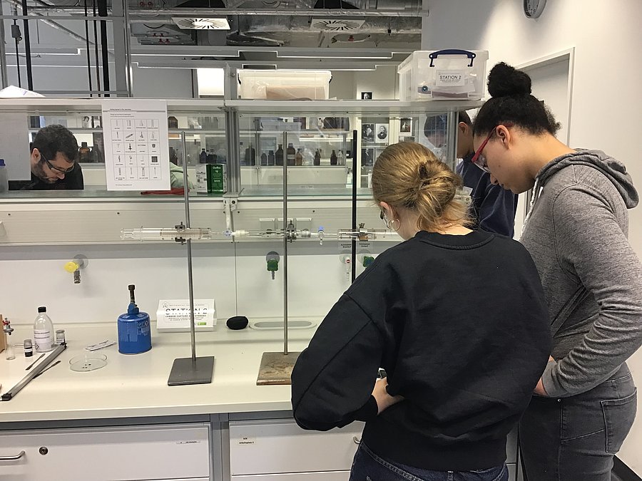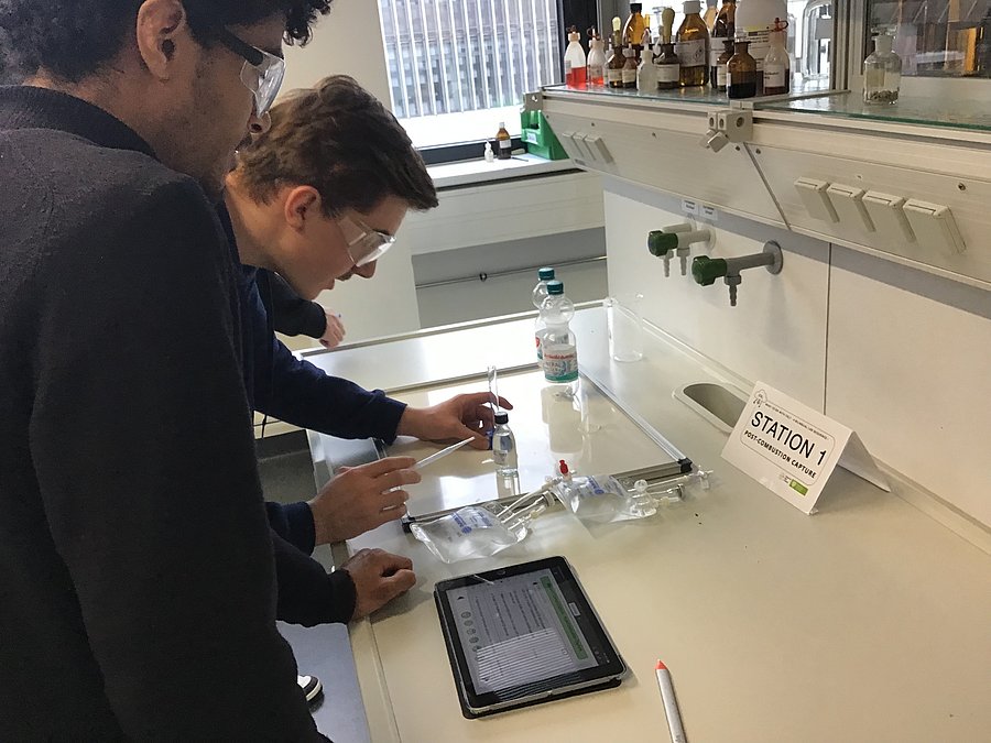 Die bilinguale Chemie-Labothek mit dem Titel „What to do with CO2?“ umfasst Arbeitsstationen zum Thema "Carbon Capture" (Kohlenstoffdioxidabtrennung), "Carbon Storage" (Kohlenstoffdioxidspeicherung) und "Carbon Utilisation" (Verwendung von Kohlenstoffdioxid).
