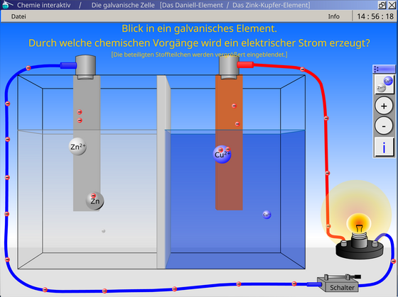 Teil 1: Erkundung einer glavanischen Zelle (Zn-Cu-Zelle) mit Elektrodenvorgängen auf der Teilchenebene, Fachbegriffen und Erläuterungen bei Spannungsmessung oder Strommessung. Plus: Interaktive Aufgaben.