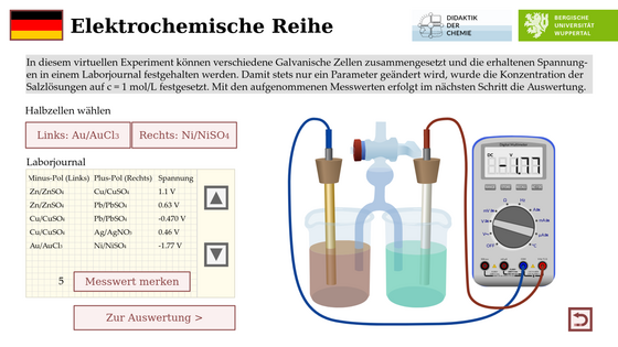 Diese Animation erlaubt es in virtuellen Experimenten die elektrochemische Spannungsreihe zu erkunden. Auswertungs-Tools und Aufgaben dienen der Erschließung der Gesetzmäßigkeiten und das Wissen kann anschließend in drei Aufgaben angwendet werden.