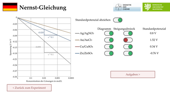 Diese Animation erlaubt es in virtuellen Experimenten die einfache Nernst-Gleichung zu erschließen. Dazu können in virtuellen Experimenten verschiedene Konzentrationszellen gebaut und vermessen werden. Über die Standardpotenziale können die Gesetzmäßigkeiten erschlossen werden und in einem freien Experiment können verschiedene Hypothesen über die zu erhaltene Spannung aufgestellt und überprüft werden.