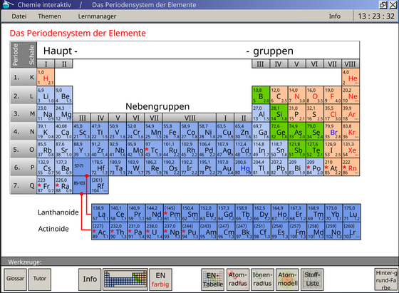 Die Animation zeigt ein Periodensystem der Elemente PSE (Umschaltbar: Nur Hauptgruppen oder mit Nebengruppen). Zusätzlich lassen sich einige Stoffdaten einblenden. Ebenfalls können Elektronegativitäten, Atom- und Ionenradien und Schalenmodelle angezeigt werden. Tutorium und Glossar sind leider nicht vollständig. Die Stoffdaten enthalten noch die früheren Gefahrensymbole und - daten nach R/S-System und nicht nach GHS.