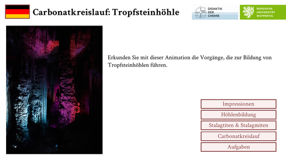 Mit dieser Animation können die Vorgänge, die zur Bildung von Tropfsteinhöhlen führen, erkundet werden. Anknüpfungsmöglichkeiten bestehen zum chemischen Gleichgewicht.