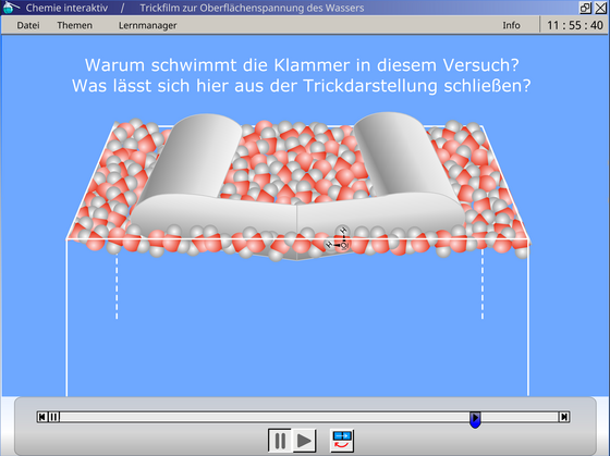 Szene 5: Teilchenmodell zum Versuch 2; Erläuterungen der Oberflächenspannung des Wassers.