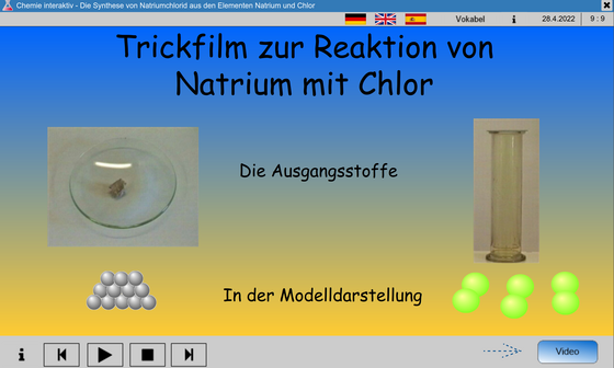 Animation und Video zeigen die Reaktion von Natrium mit Chlor.