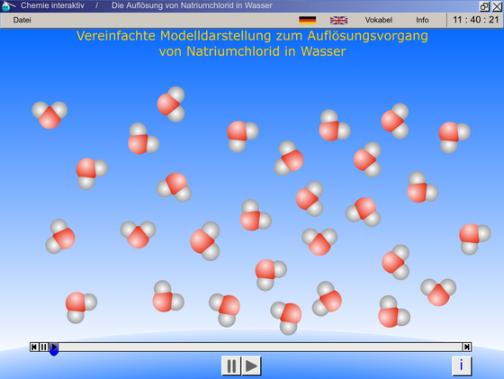 Die Animation zeigt in einem Teilchenmodell, wie ein NaCl-Kristall von Wassermolekülen aufgelöst wird.