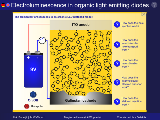 Eine interaktive Animation zur Vertiefung in die Elementarprozesse einer OLED in zwei gestuften Modellen.