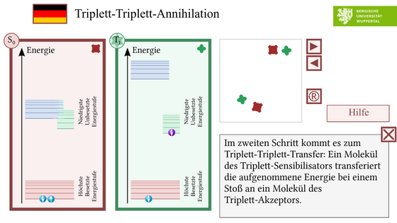 Diese Animation zeigt die einzelnen Schritte, die zur Triplett-Triplett-Annihilation führen - ein Phänomen bei dem längerwelliges Licht (z.B. grünes Licht) in kürzerwelliges (z.B. blaues Licht) umgewandelt wird.