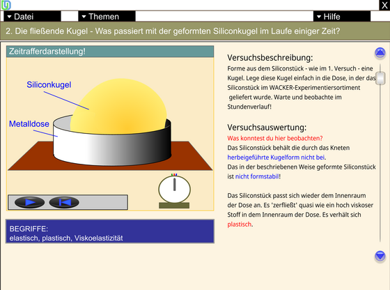 Untersuchung der Eigenschaften des viskoelastischen Silicons sowie Erklärungen der Phänomene anhand von interaktiven Animationen.