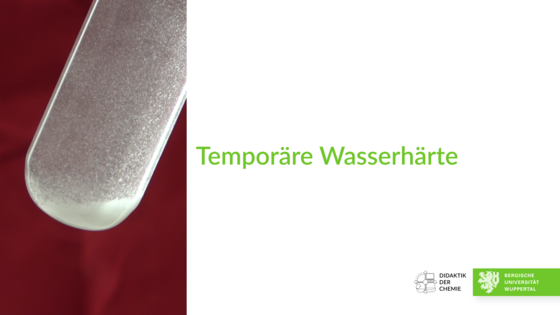 Im Video wird die Temporäre Wasserhärte demonstriert: Es wird Kohlenstoffdioxid in Kalkwasser eingeleitet, bis dieses wieder aufklart. Die klare Lösung wird anschließend mithilfe eines Gasbrenners erhitzt.