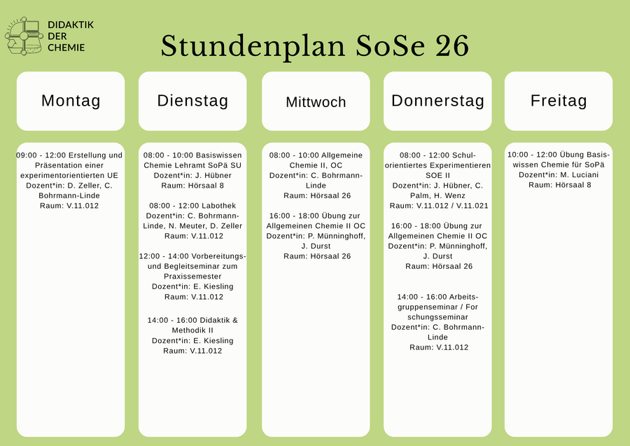 Im Rahmen des Seminars Methodik und Didaktik I sollen 5 Vorträge oder Lehrerfortbildungen, z. B. auch NeDiChe-Vorträge, besucht werden. Hier finden sie einen Vordruck, in dem Sie diese sammeln können: