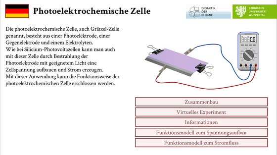 Overview, construction and functional principle of the photo electro chemical element in writing and with pictures.