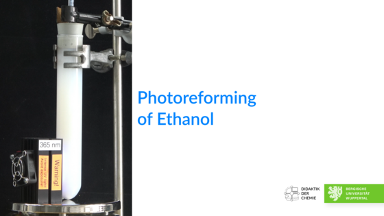 Ethanol is converted to hydrogen and other by-products using a titanium dioxide-based photocatalyst in a simple experimental setup. Afterwards, the oxyhydrogen test is used to prove that the collected gas is hydrogen.